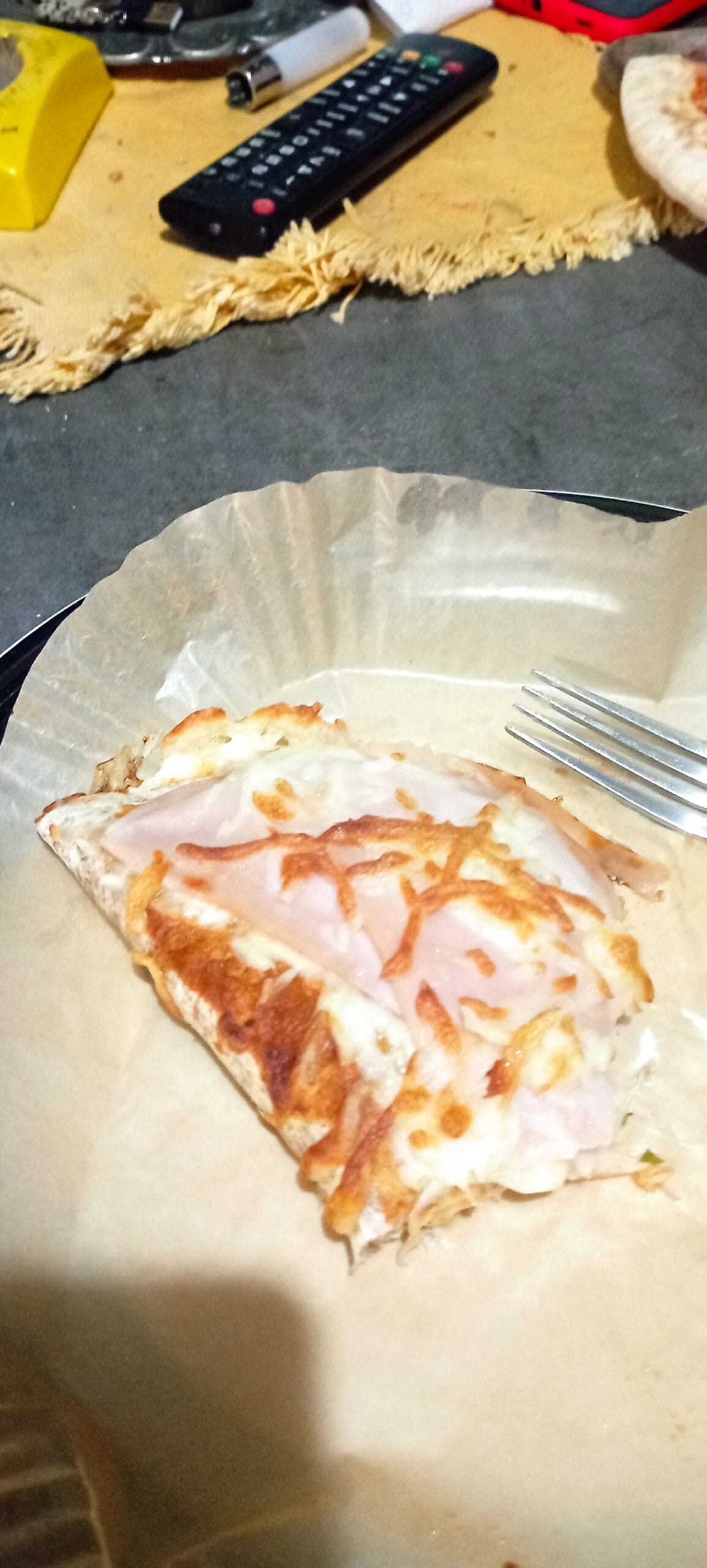 Pizza saudável para o jantar de hoje feita com tortilha integral, molho de tomate caseiro, clara de ovo mozzarella light e fiambre de frango. Deliciosa e não nos deixa cair na tentação quando toda a gente em casa come pizza de compra.
