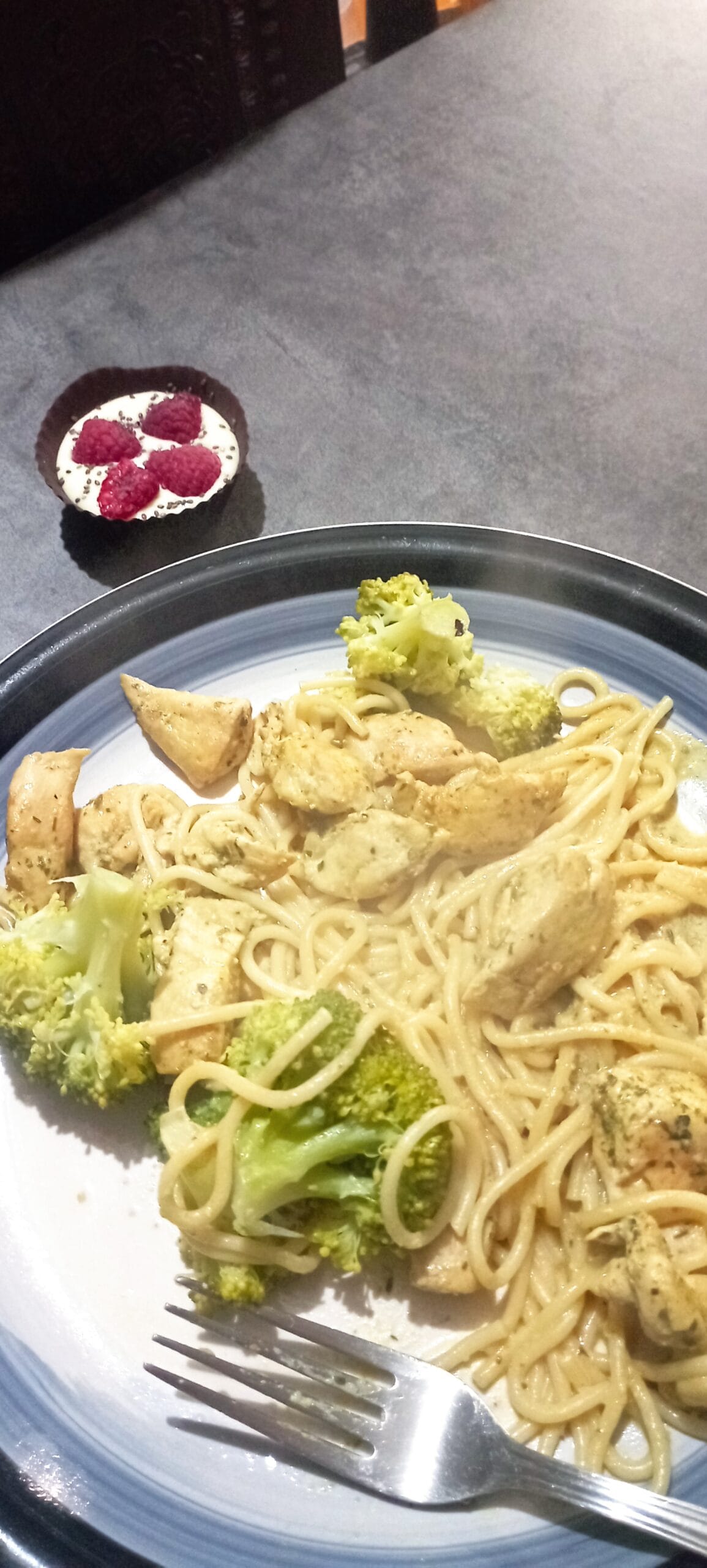 Jantar de de hoje com direito a sobremesa, bombom proteico de framboesa e chia 😋
